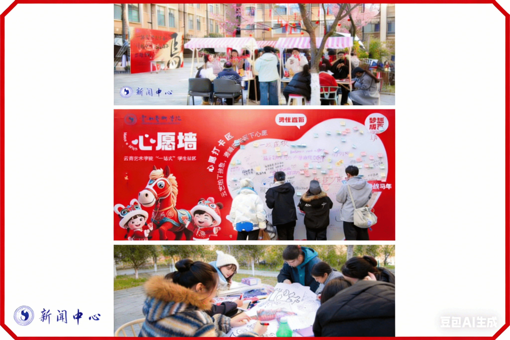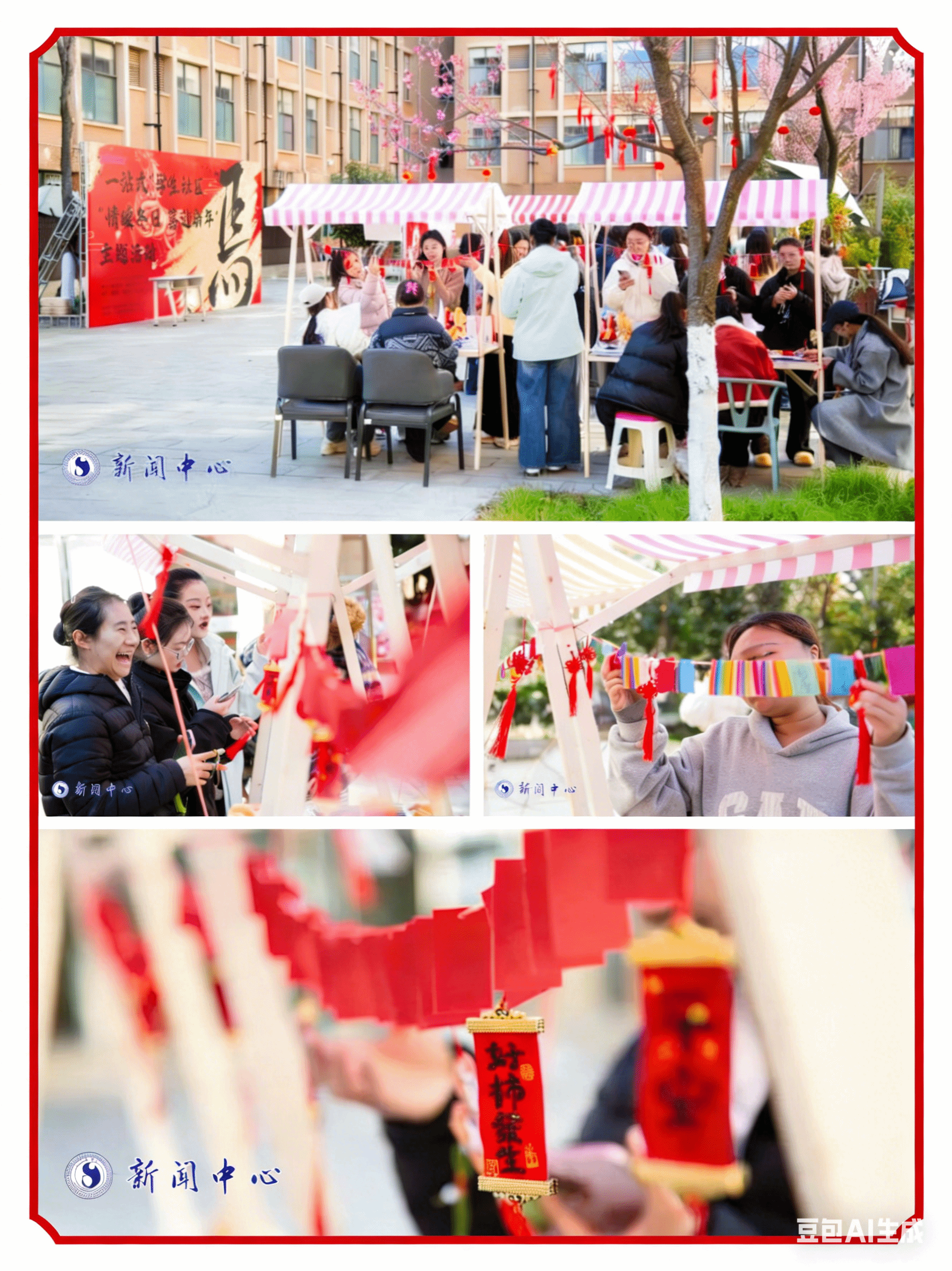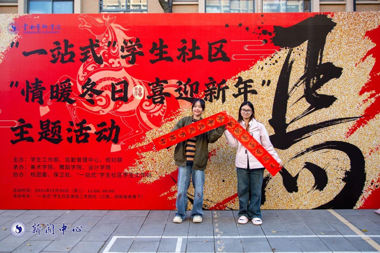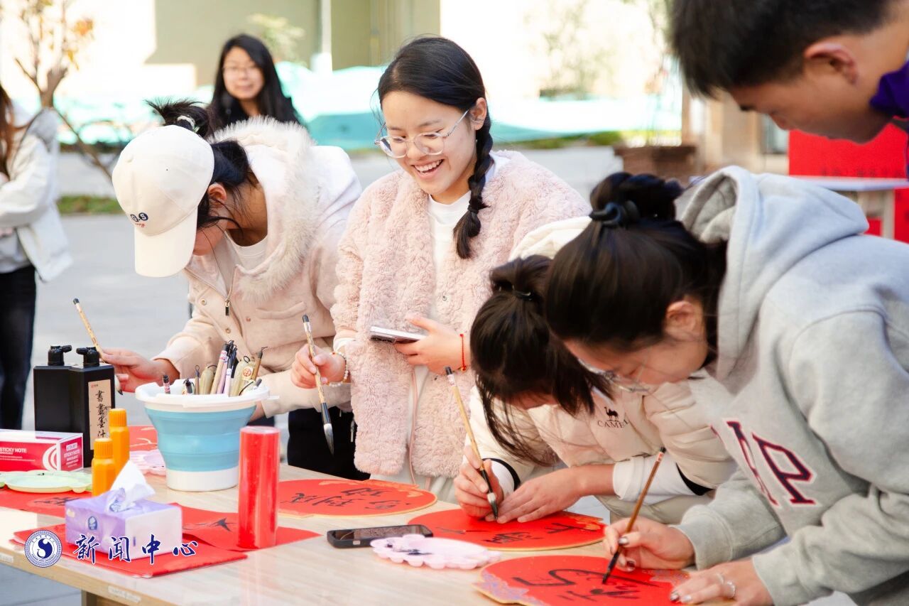 活动围绕“文化传承、艺术实践、情感交融”三大主线,精心设置五大环节、十余项子项目,推动优秀传统文化与学生专业特长深度融合。现场以民族舞蹈快闪活力开场,师生们于留影墙前合影,在寄语墙上书写新年愿景,传递真挚祝福。游园区域,150副对联与200条灯谜巧妙融入传统年俗,师生在趣味竞猜中感受中华智慧,现场气氛热烈,笑语连连。